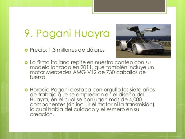 - 10. 9. Pagani Huayra Precio: 1.3 millones de dólares La firma italiana repite en nuestro conteo con su modelo lanzado en 2011, que también incluye un motor Mercedes AMG V12 de 730 caballos de fuerza. Horacio Pagani destaca con orgullo los siete años de trabajo que se emplearon en el diseño del Huayra, en el cual se conjugan más de 4,000 componentes (sin incluir el motor ni la transmisión), lo cual habla del cuidado y el esmero en su creación.