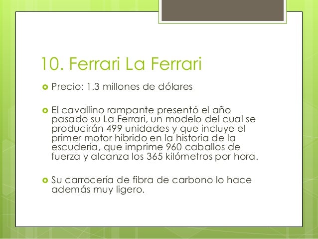 - 11. 10. Ferrari La Ferrari Precio: 1.3 millones de dólares El cavallino rampante presentó el año pasado su La Ferrari, un modelo del cual se producirán 499 unidades y que incluye el primer motor híbrido en la historia de la escudería, que imprime 960 caballos de fuerza y alcanza los 365 kilómetros por hora. Su carrocería de fibra de carbono lo hace además muy ligero.