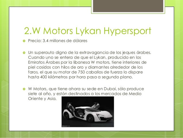 - 3. 2.W Motors Lykan Hypersport Precio: 3.4 millones de dólares Un superauto digno de la extravagancia de los jeques árabes. Cuando uno se entera de que el Lykan, producido en los Emiratos Árabes por la libanesa W motors, tiene interiores de piel cosidos con hilos de oro y diamantes alrededor de los faros, el que su motor de 750 caballos de fuerza lo dispare hasta 400 kilómetros por hora pasa a segundo plano. W Motors, que tiene ahora su sede en Dubai, sólo produce siete al año, y están destinados a los mercados de Medio Oriente y Asia.