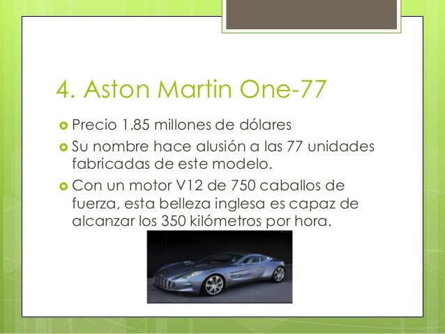- 5. 4. Aston Martin One-77 Precio 1.85 millones de dólares Su nombre hace alusión a las 77 unidades fabricadas de este modelo. Con un motor V12 de 750 caballos de fuerza, esta belleza inglesa es capaz de alcanzar los 350 kilómetros por hora.