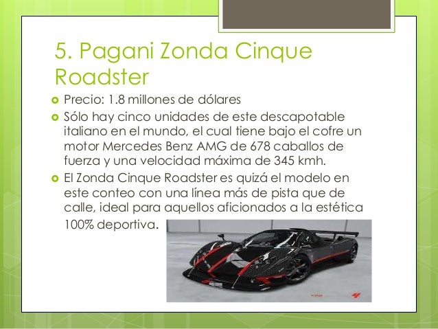 - 6. 5. Pagani Zonda Cinque Roadster Precio: 1.8 millones de dólares Sólo hay cinco unidades de este descapotable italiano en el mundo, el cual tiene bajo el cofre un motor Mercedes Benz AMG de 678 caballos de fuerza y una velocidad máxima de 345 kmh. El Zonda Cinque Roadster es quizá el modelo en este conteo con una línea más de pista que de calle, ideal para aquellos aficionados a la estética 100% deportiva.