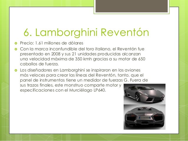 - 7. 6. Lamborghini Reventón Precio: 1.61 millones de dólares Con la marca inconfundible del toro italiano, el Reventón fue presentado en 2008 y sus 21 unidades producidas alcanzan una velocidad máxima de 350 kmh gracias a su motor de 650 caballos de fuerza. Los diseñadores en Lamborghini se inspiraron en los aviones más veloces para crear las líneas del Reventón, tanto, que el panel de instrumentos tiene un medidor de fuerzas G. Fuera de sus trazos finales, este monstruo comparte motor y especificaciones con el Murciélago LP640.