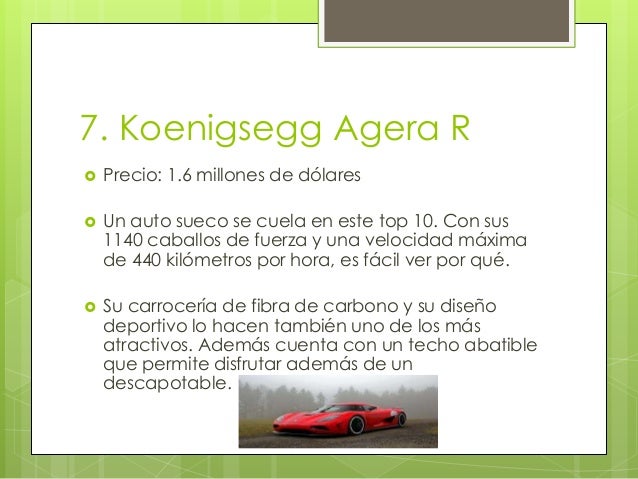 - 8. 7. Koenigsegg Agera R Precio: 1.6 millones de dólares Un auto sueco se cuela en este top 10. Con sus 1140 caballos de fuerza y una velocidad máxima de 440 kilómetros por hora, es fácil ver por qué. Su carrocería de fibra de carbono y su diseño deportivo lo hacen también uno de los más atractivos. Además cuenta con un techo abatible que permite disfrutar además de un descapotable.