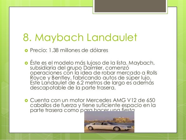 - 9. 8. Maybach Landaulet Precio: 1.38 millones de dólares Éste es el modelo más lujoso de la lista. Maybach, subsidiaria del grupo Daimler, comenzó operaciones con la idea de robar mercado a Rolls Royce y Bentley, fabricando autos de súper lujo. Este Landaulet de 6.2 metros de largo es además descapotable de la parte trasera. Cuenta con un motor Mercedes AMG V12 de 650 caballos de fuerza y tiene suficiente espacio en la parte trasera como para hacer una fiesta